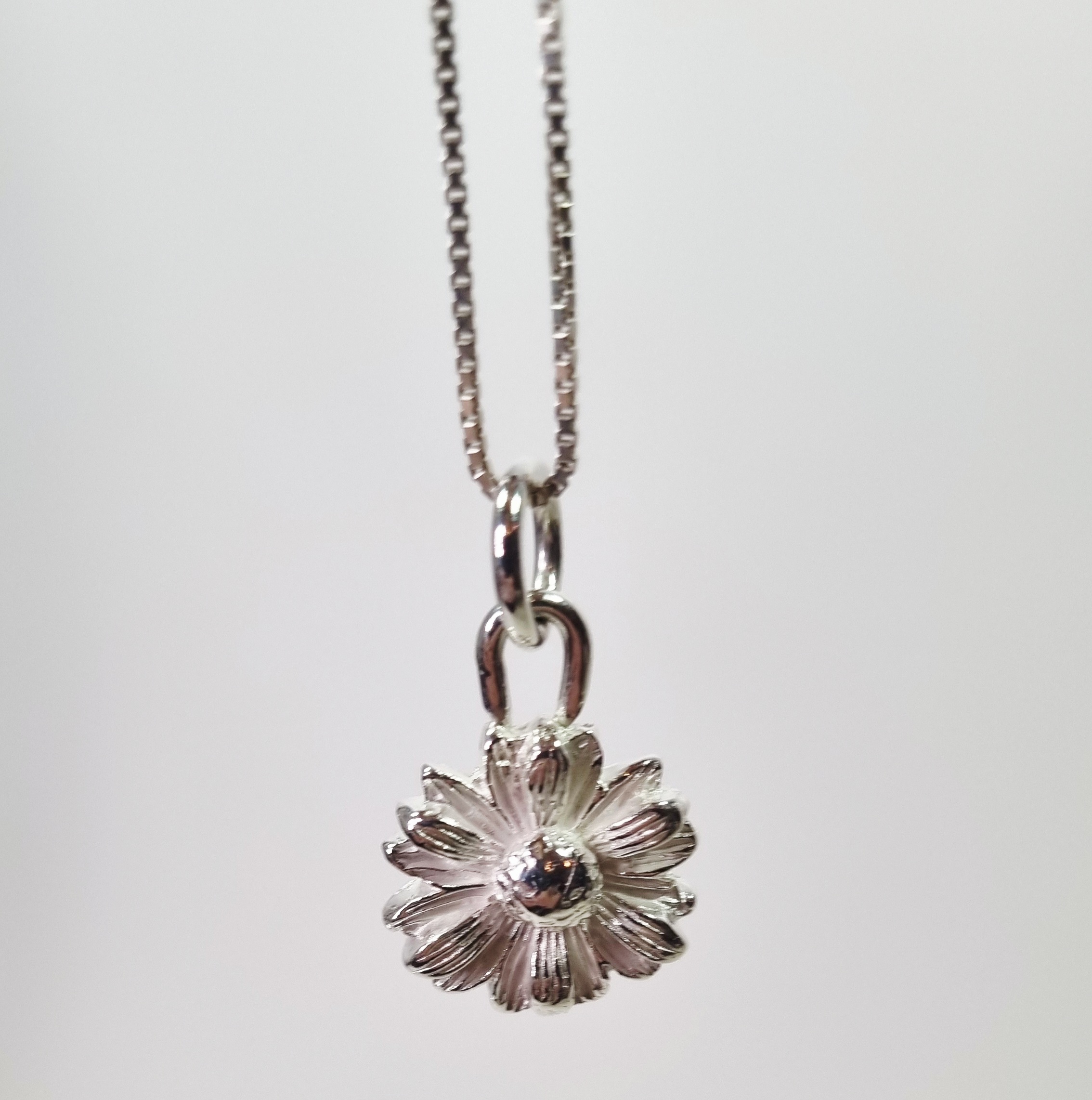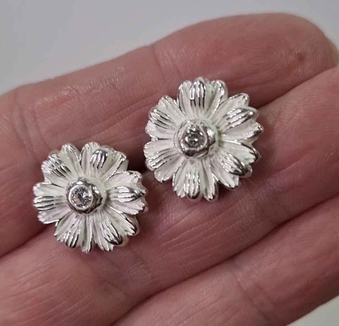 Blomsten er fremstillet i finsølv (999) og ørestikken i Sterling sølv. Når finsølvet sintrer sammen (smelter sammen) fremkommer der et fint hvidt mat lag. I blomstens “skygger” – mellem blade og i fordybninger har jeg valgt at beholde dette fine hvide “støv” som giver blomsten en hvis dybde og Marguerite udtryk. Når den oxideres er det ligeledes disse skygger i blomsten der bliver mørke.