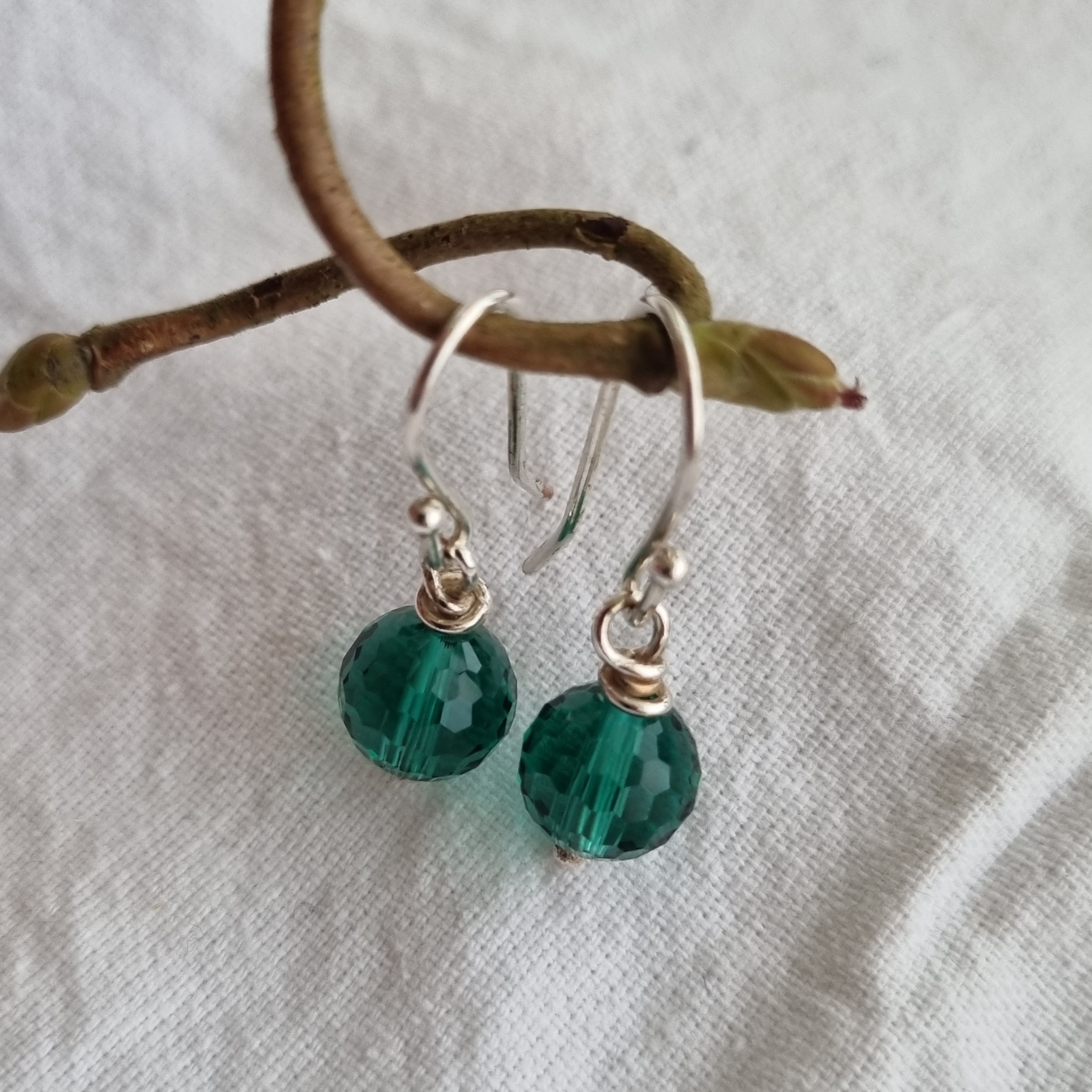 Bøjle ørering i sterling sølv med smuk petrol farvet krystalperle.
