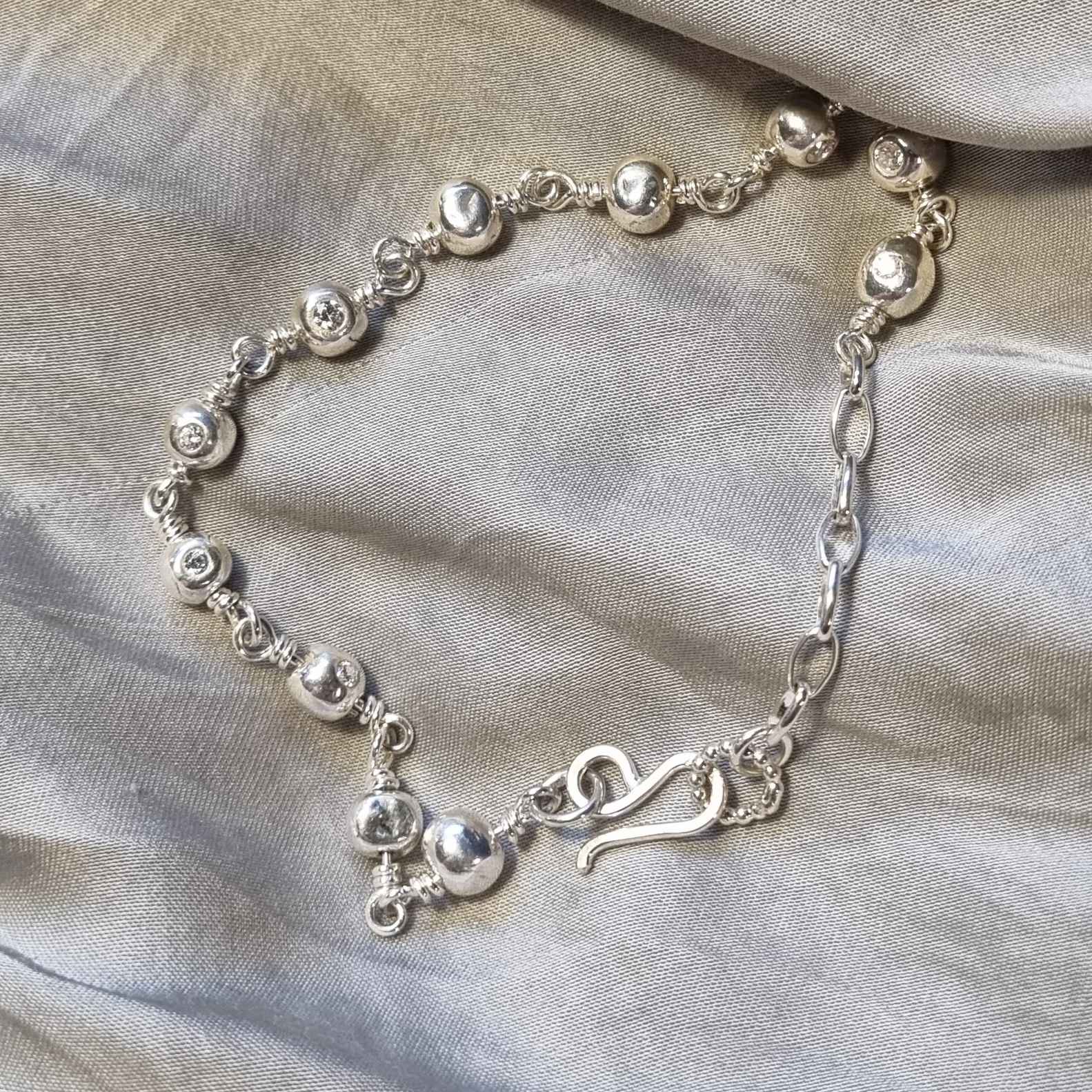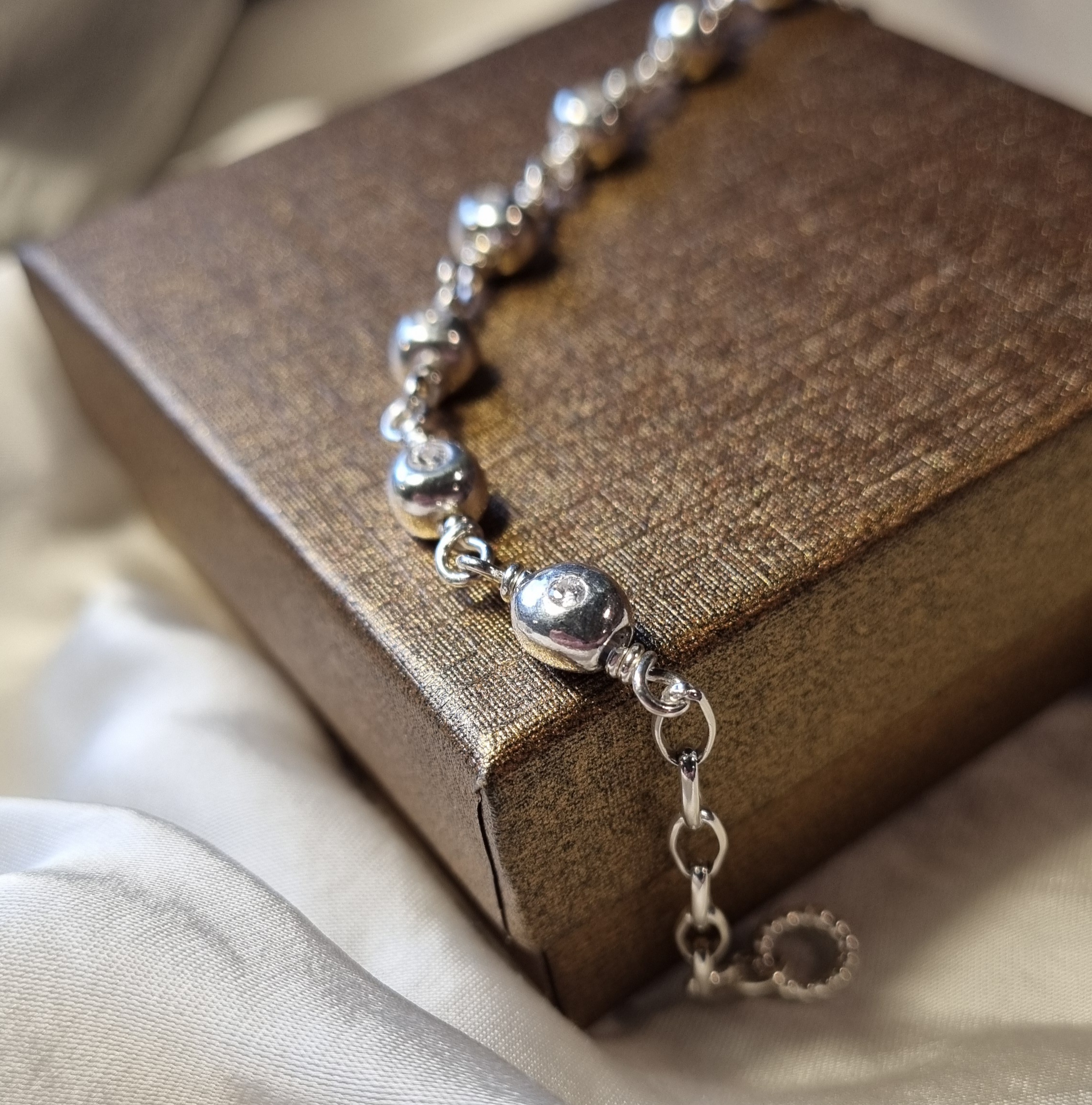 Sølvarmbånd med klare Zirkonia der er indfattet i håndlavede sølvperler er et unikt smykke.