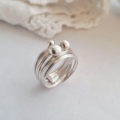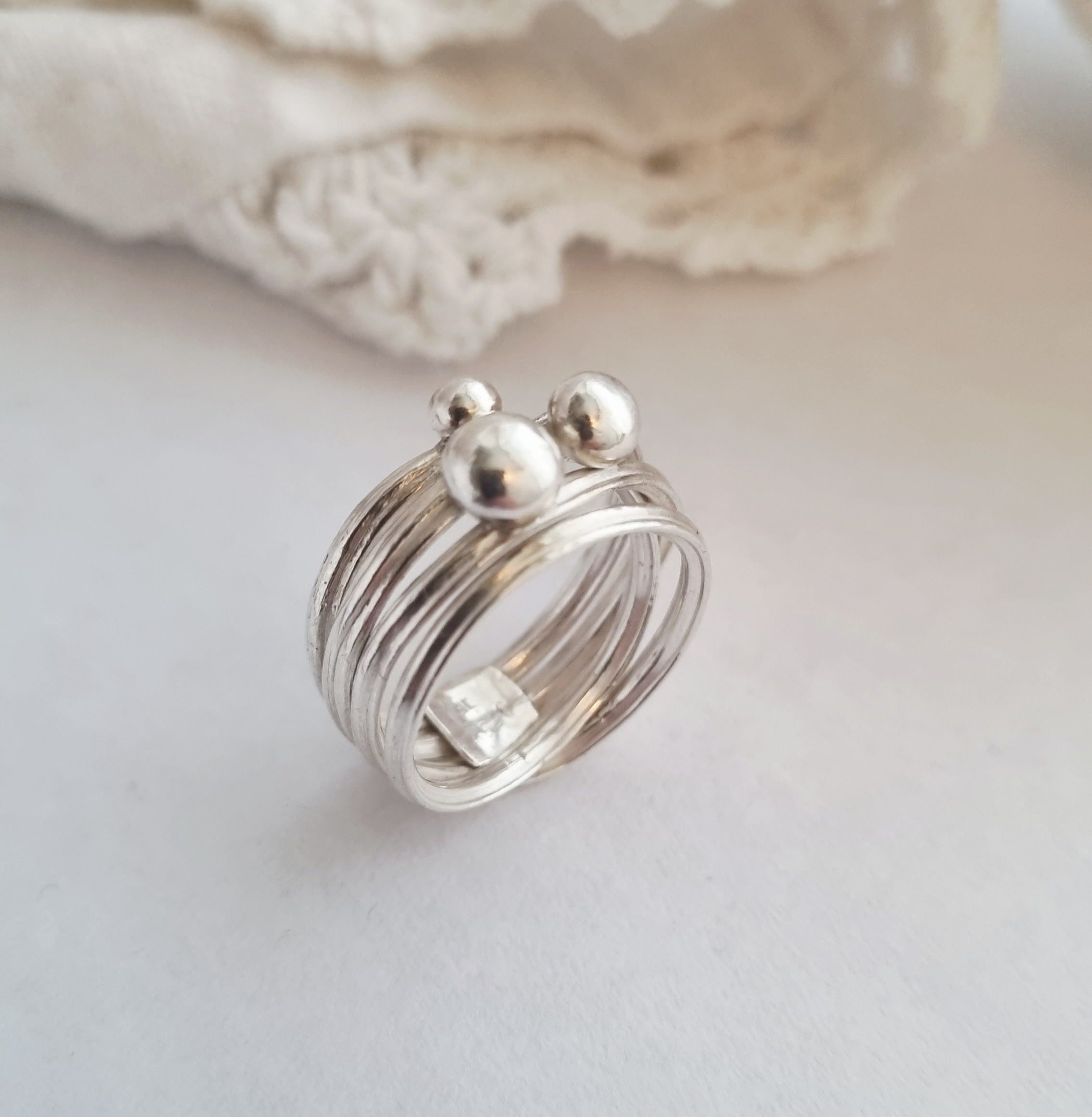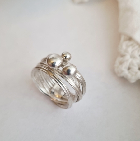 Ringen er viklet af et langt stykke tråd i Sterling sølv. Herefter monteret med 3 blanke sølvkugler. Sølvtråden som ringen er lavet af, er fremstillet af sølvrester (diverse rester fra produktionen af andre smykker). Resterne er smeltet om, valset til en ny lang tråd. Dette gør ringen helt unik og til noget ganske særligt.