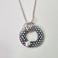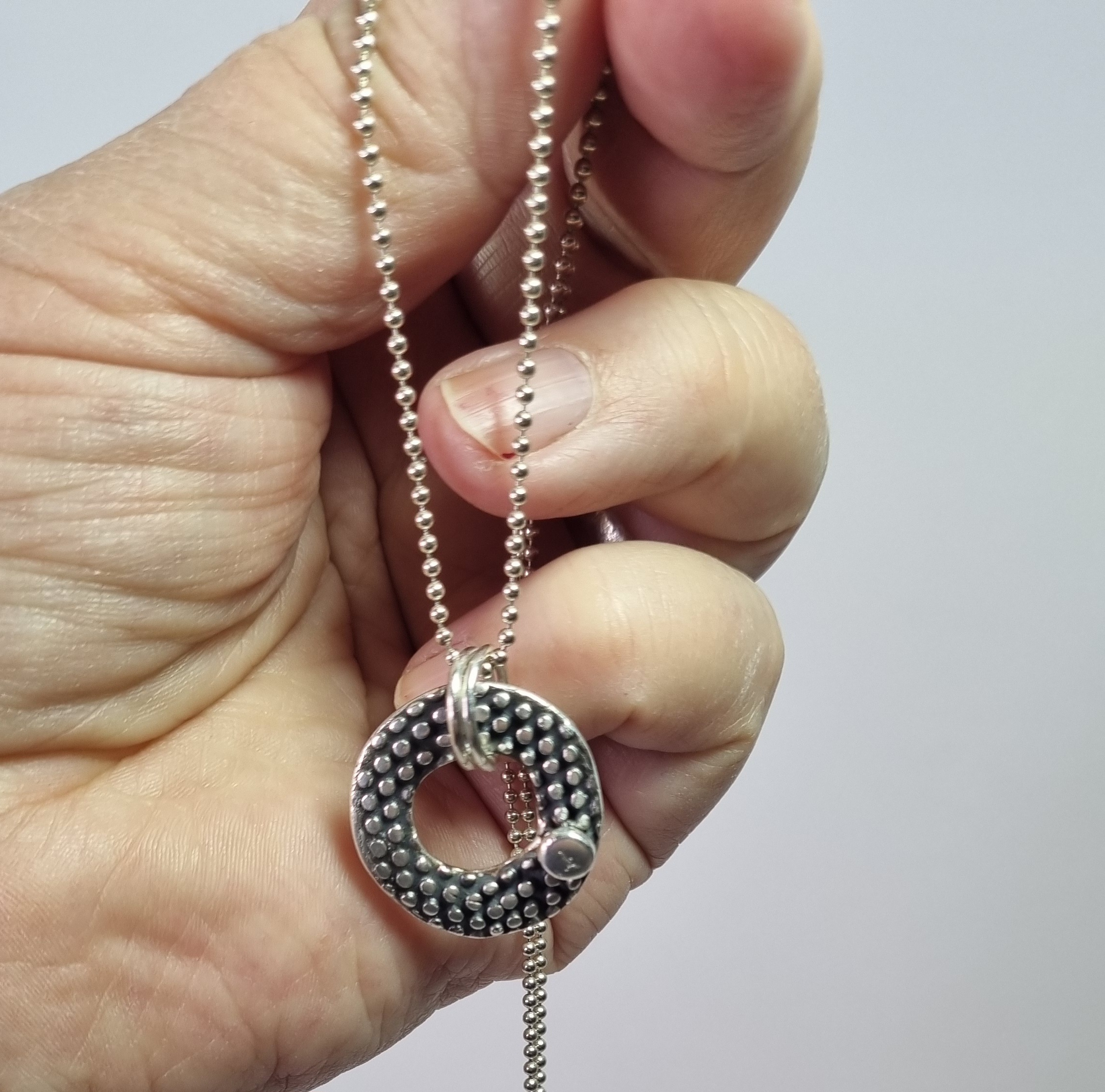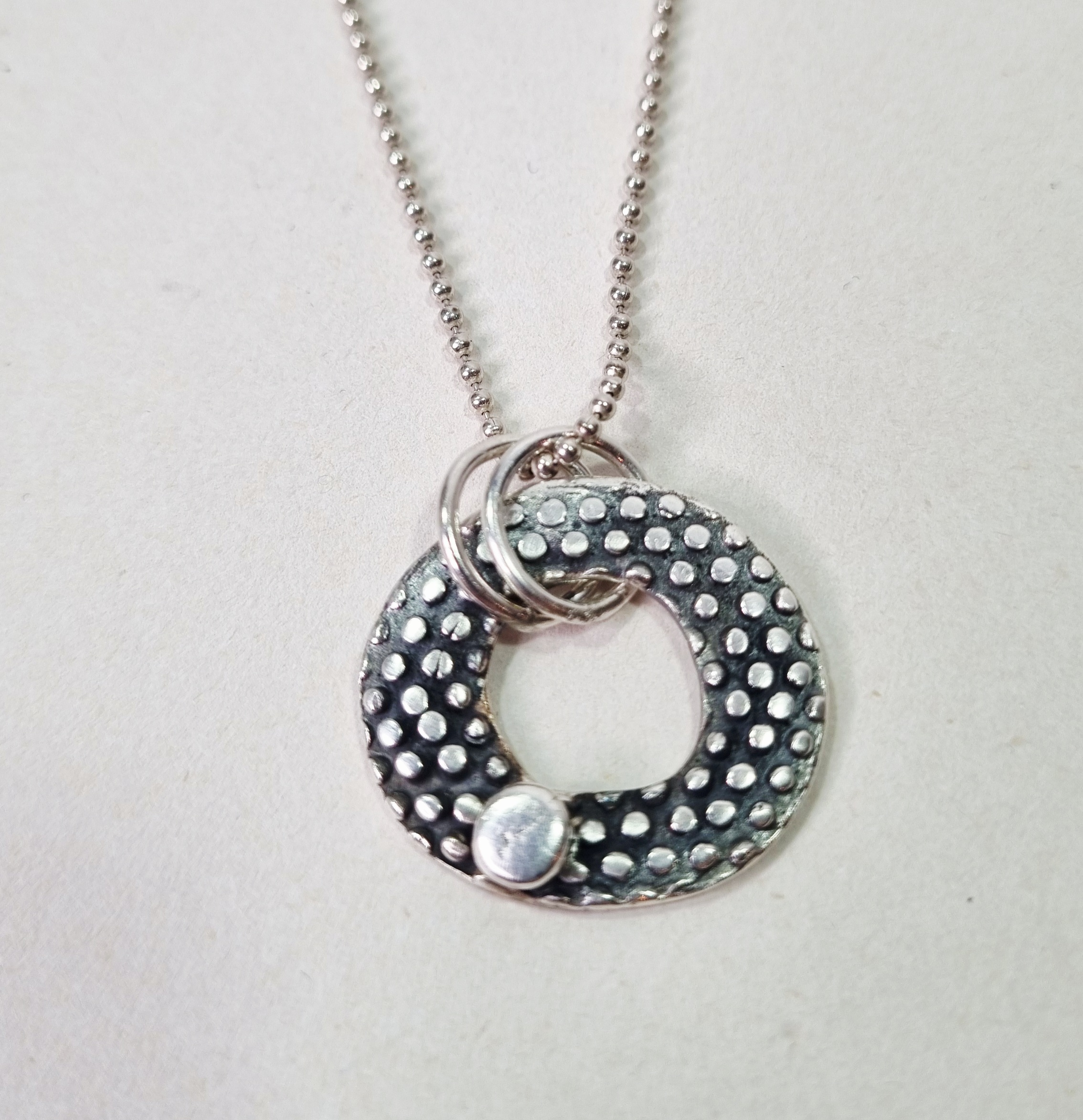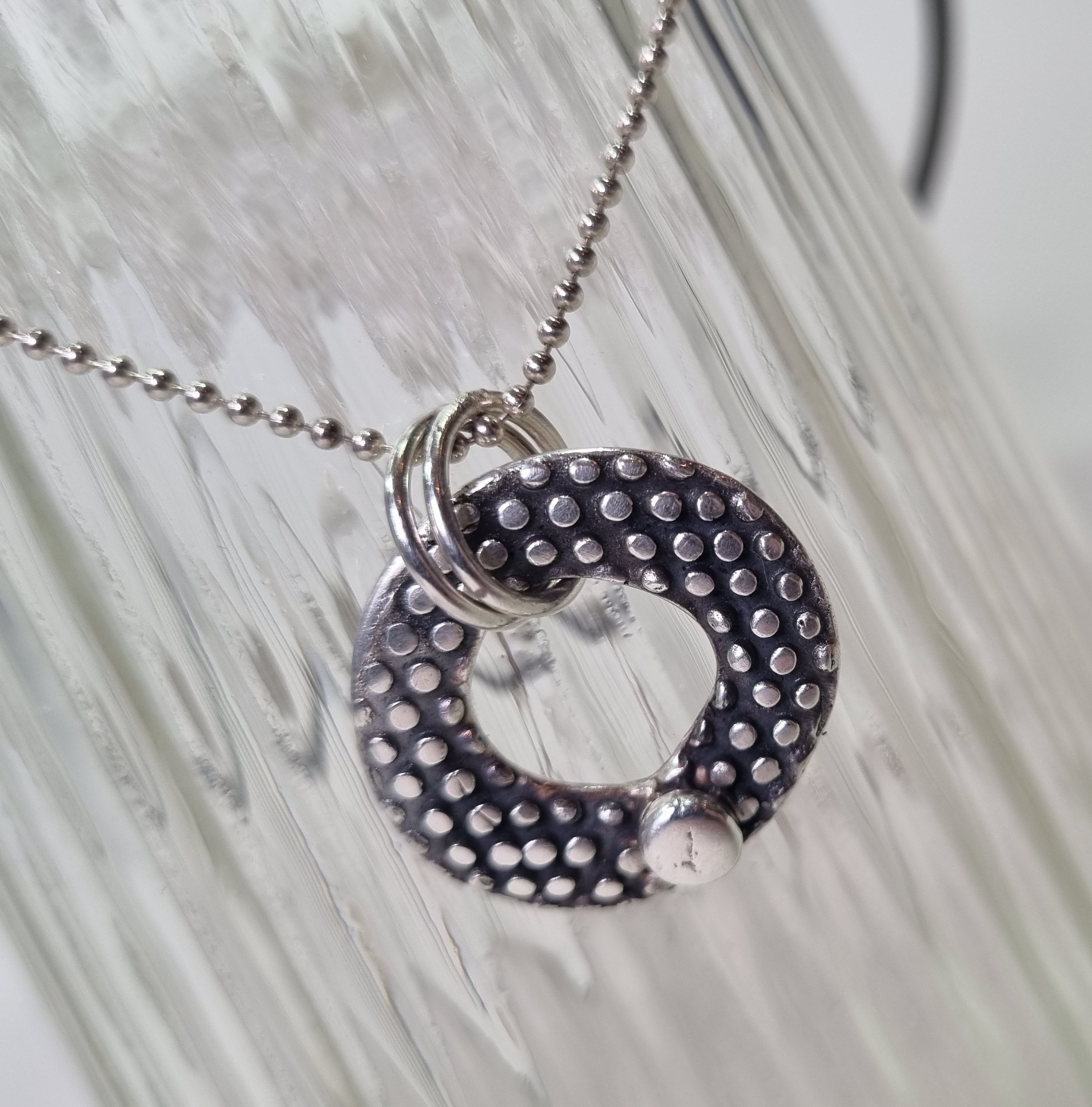 Smykket et rigtigt fint tekstureret og oxideret smykkevedhæng med mindre ringdetaljer samt fremstår rustikt og unikt og kan bæres til alle lejligheder – dagligt som til fest.