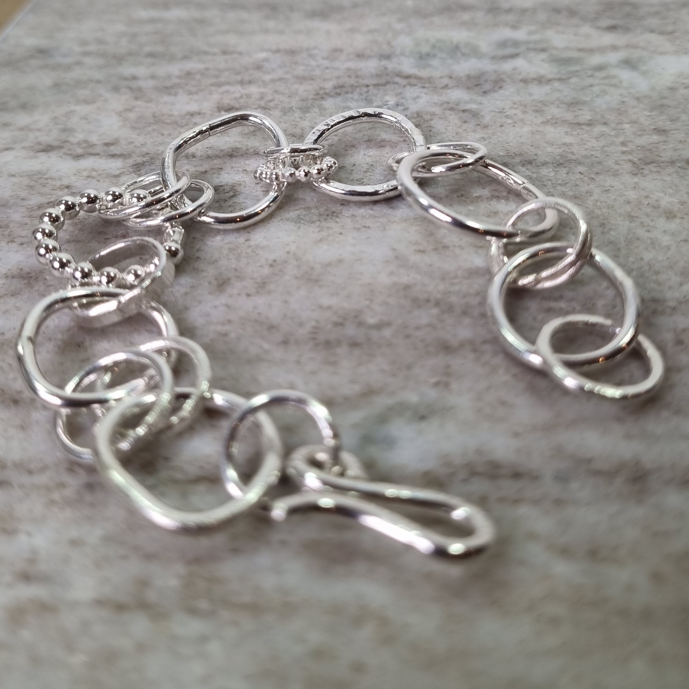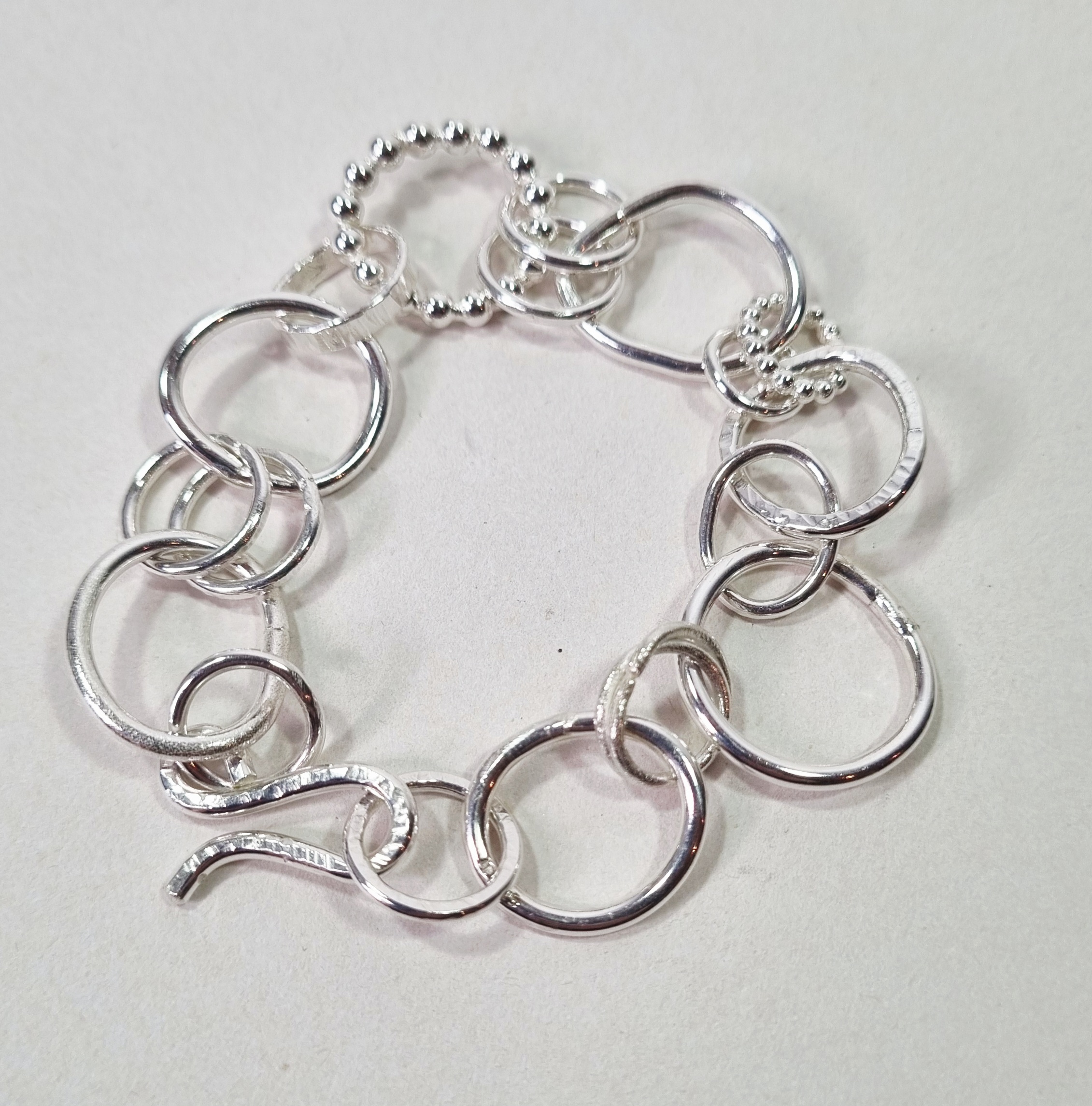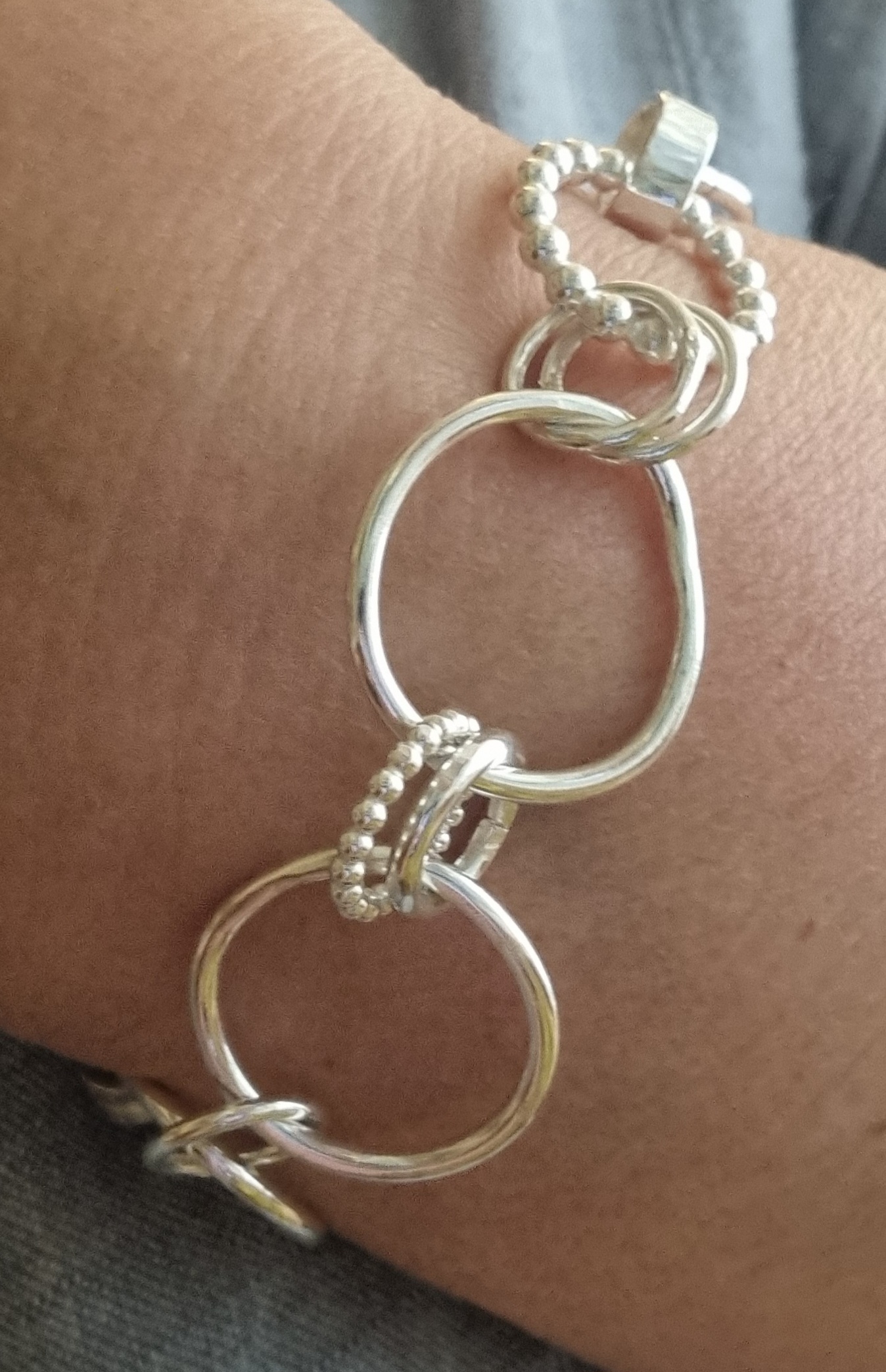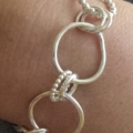 Unikt armbånd / armlænke fremstillet i kraftige organiske rustikke ringe med forskellig struktur – og samlet med mindre forskellige øskener.