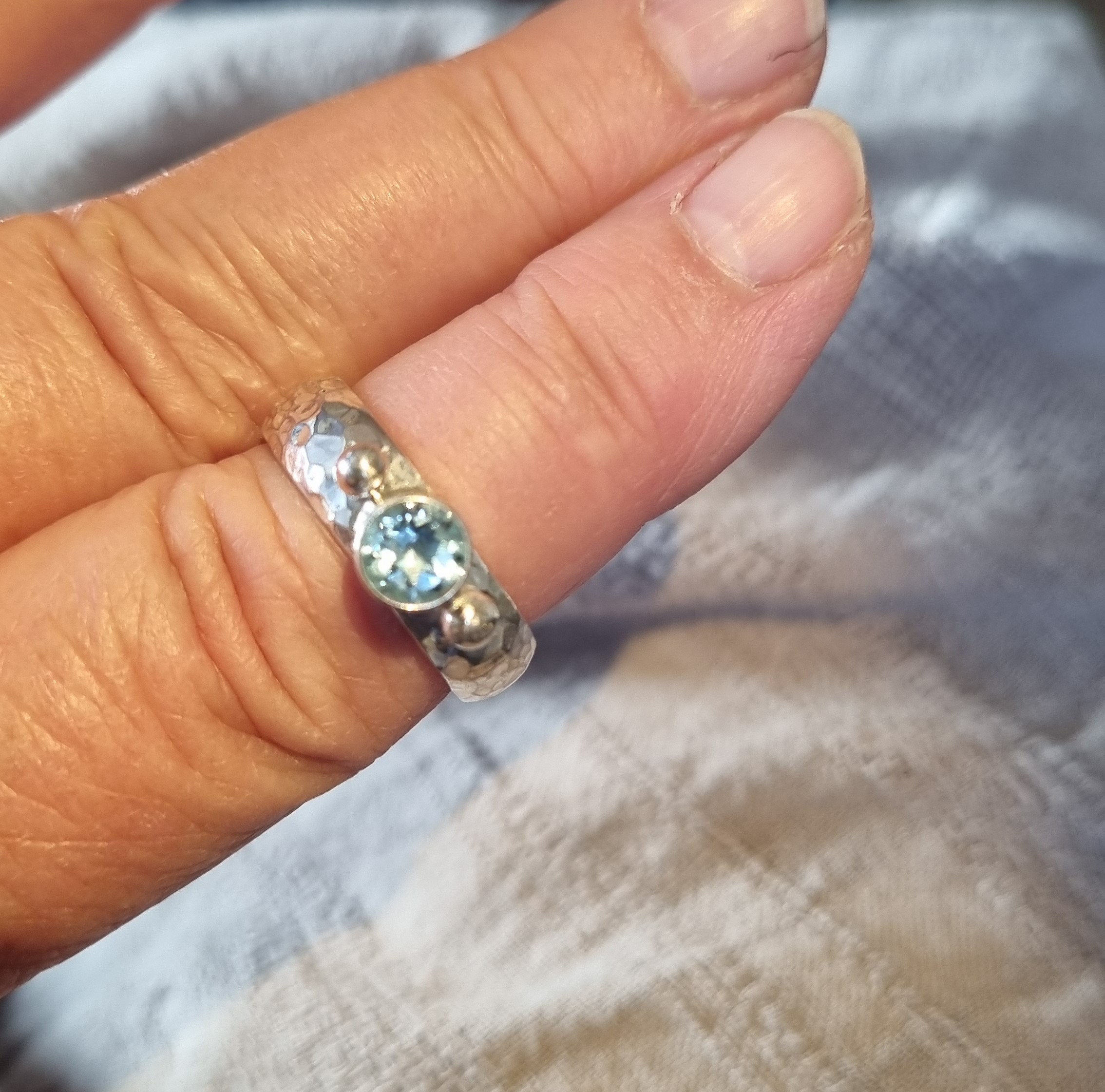 Ringen er udført i hammerslået sterling sølv 925 og indfattet med en smuk sky blue Topas.