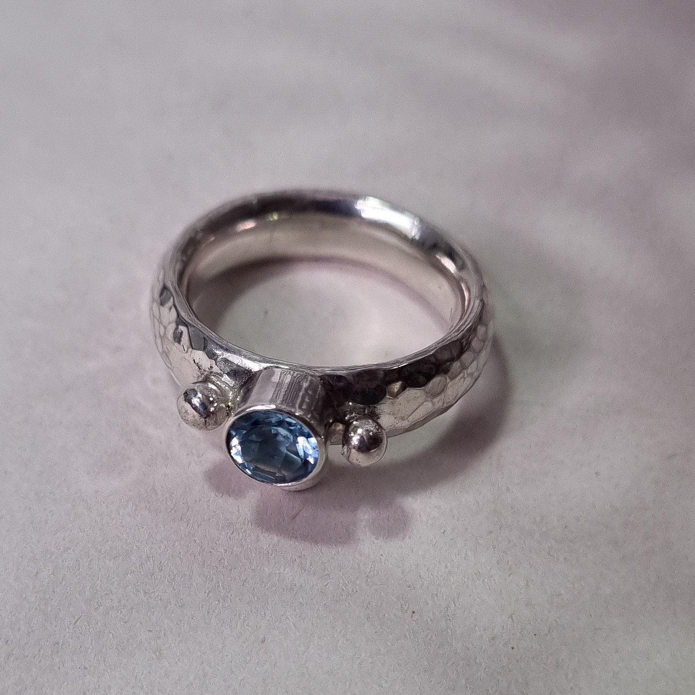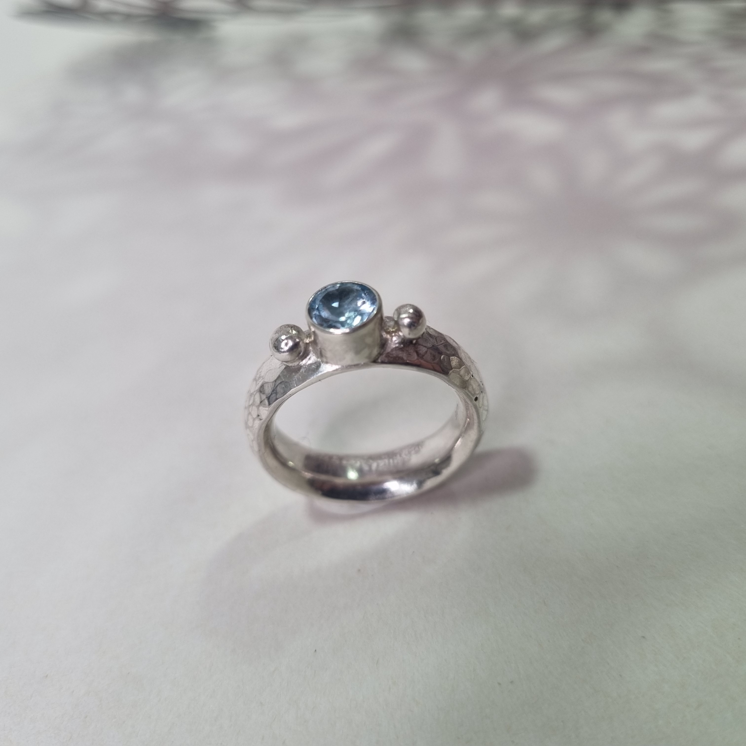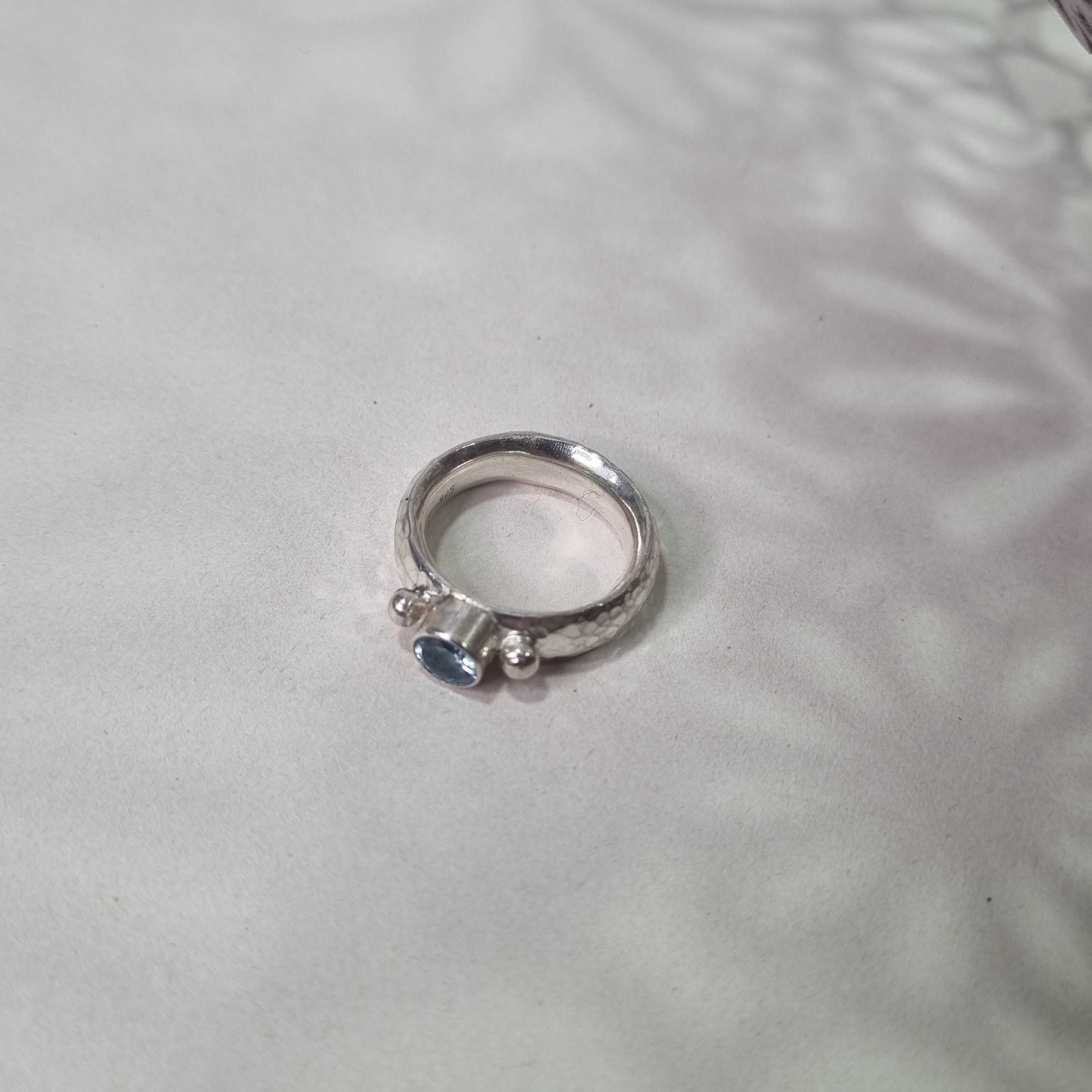 UNIKA fingerring i hammerslået sølv og smuk sky blue Topaz