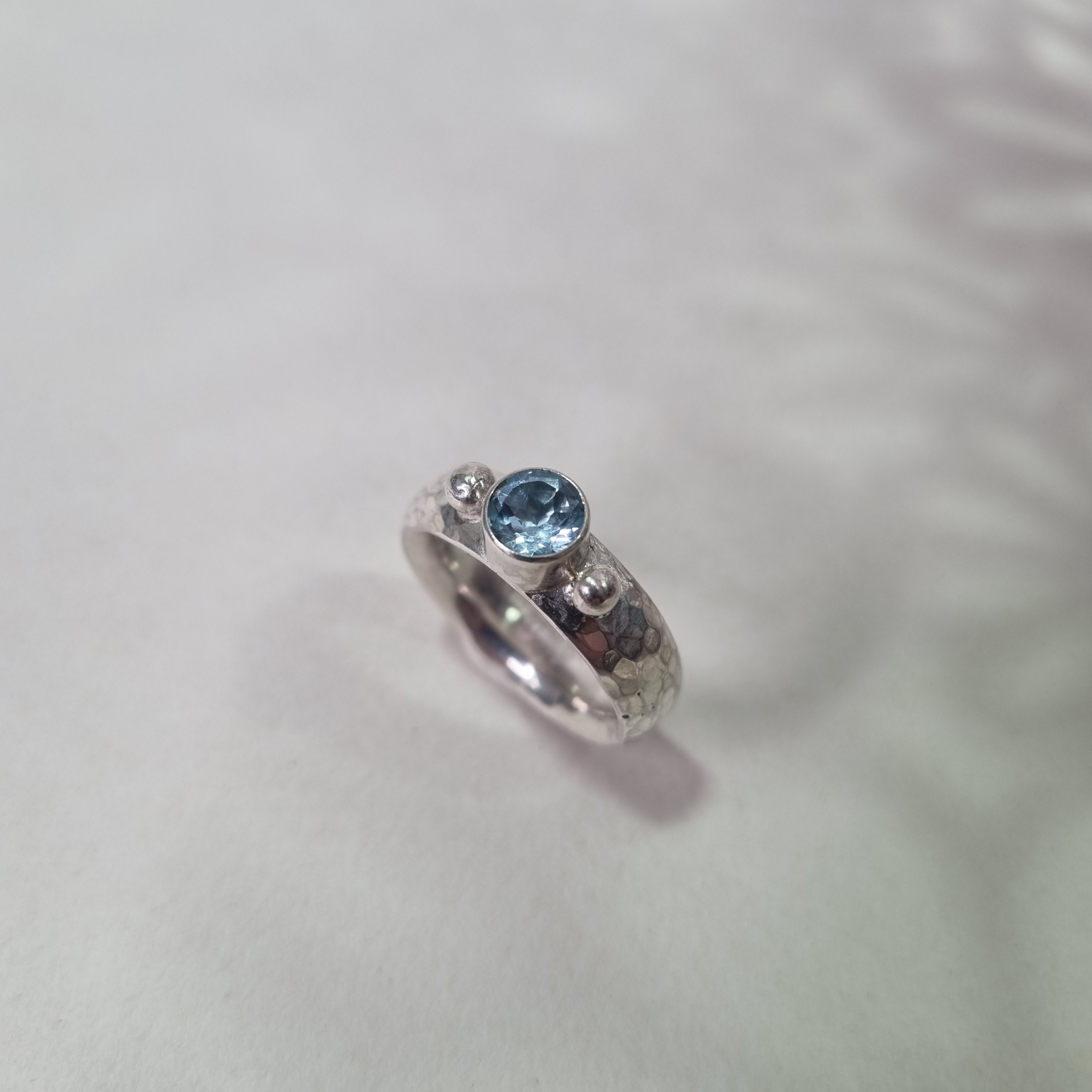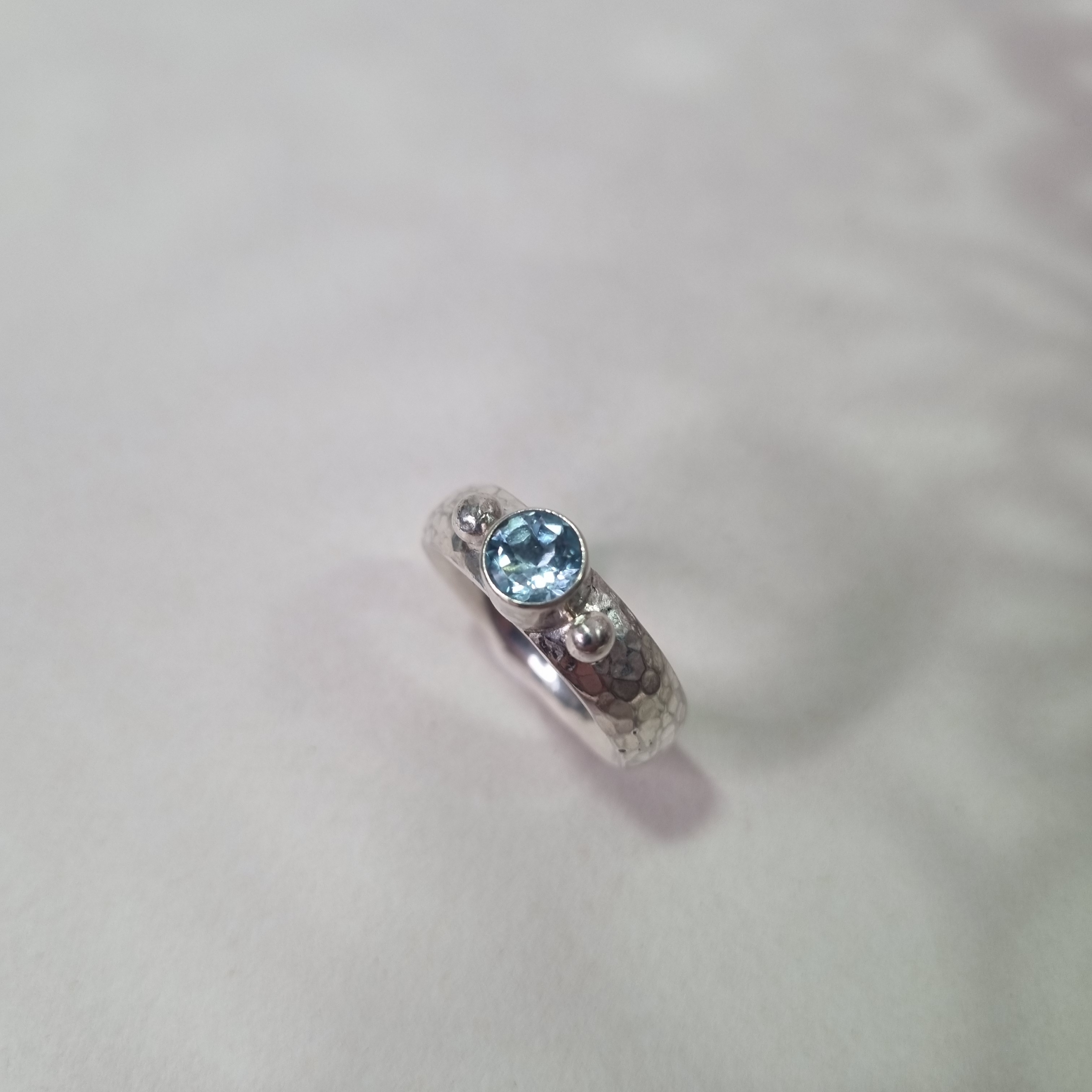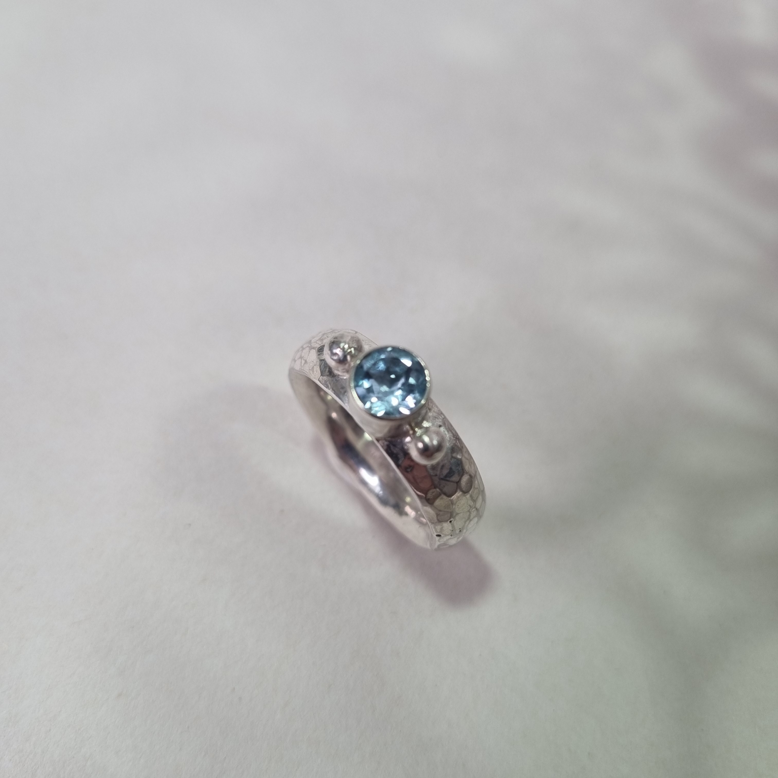 UNIKA fingerring i hammerslået sølv og smuk sky blue Topaz