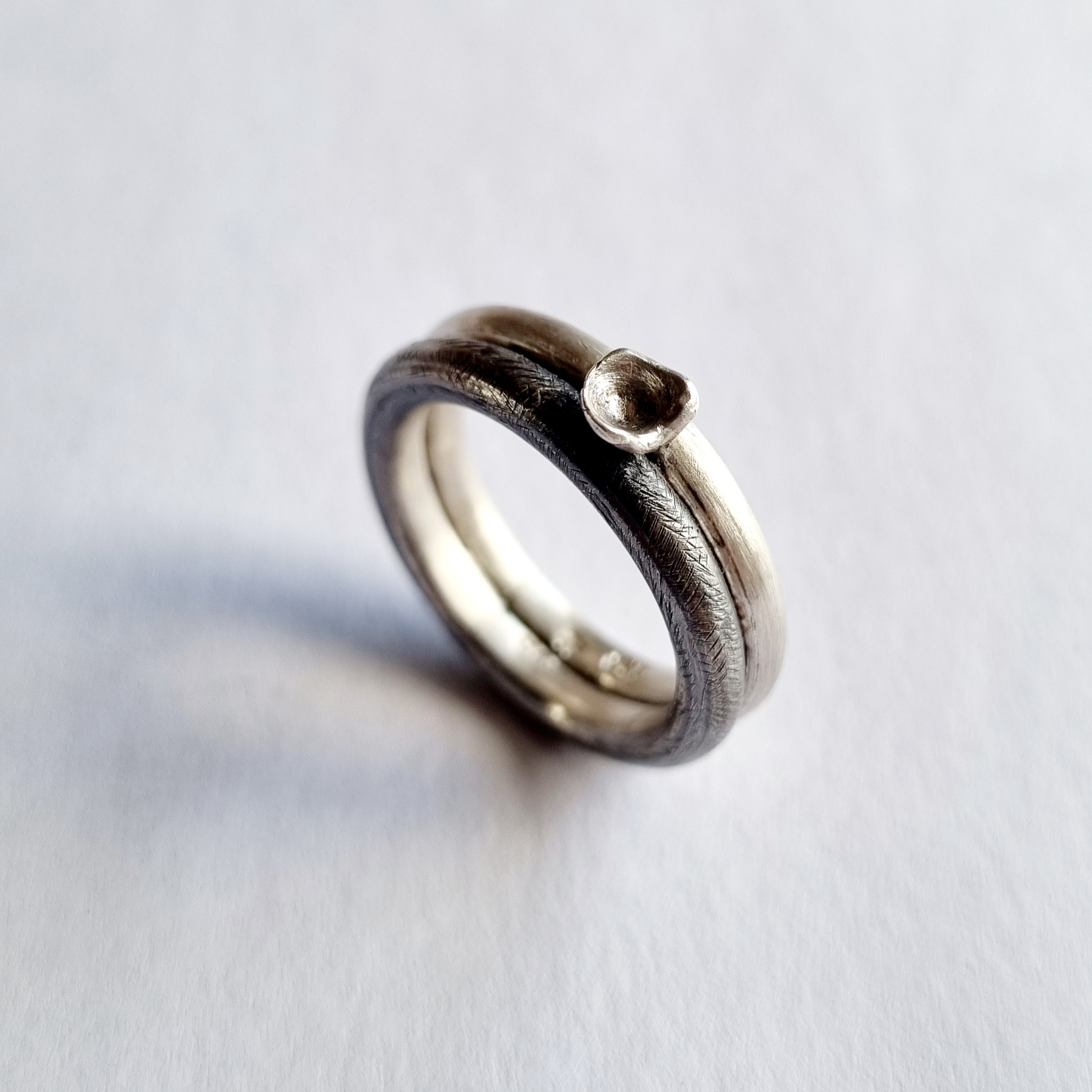 En fin sterling sølv ring som består af 2 ringe der er loddet sammen. Ovenpå sidder en lille sølvskål. Den ene ring er matteret og den anden ring er oxideret*.